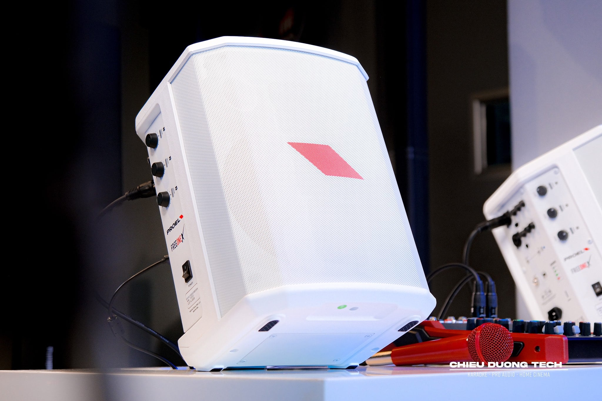 Hệ thống âm thanh di động All-Round xuất sắc cho biểu diễn, Karaoke với 2 loa Proel FreeOneX White Edition kết hợp Mixer Proel PlayMix 6 và Micro Eikon DM800 ColorKit