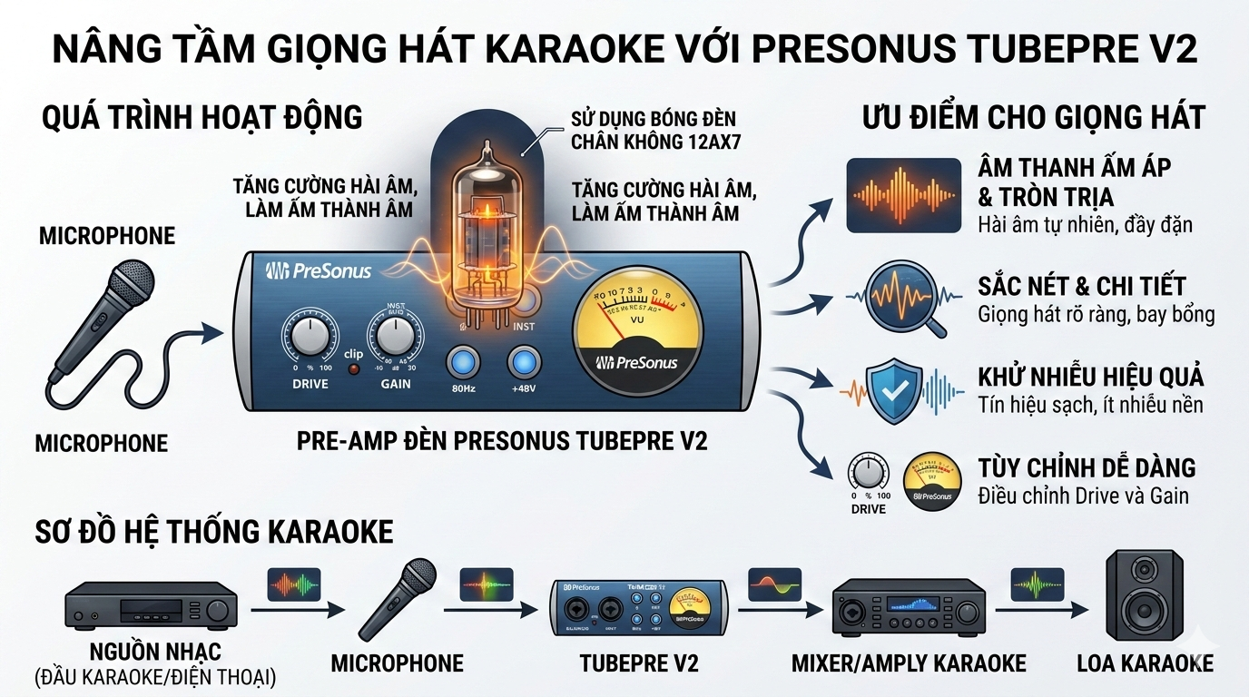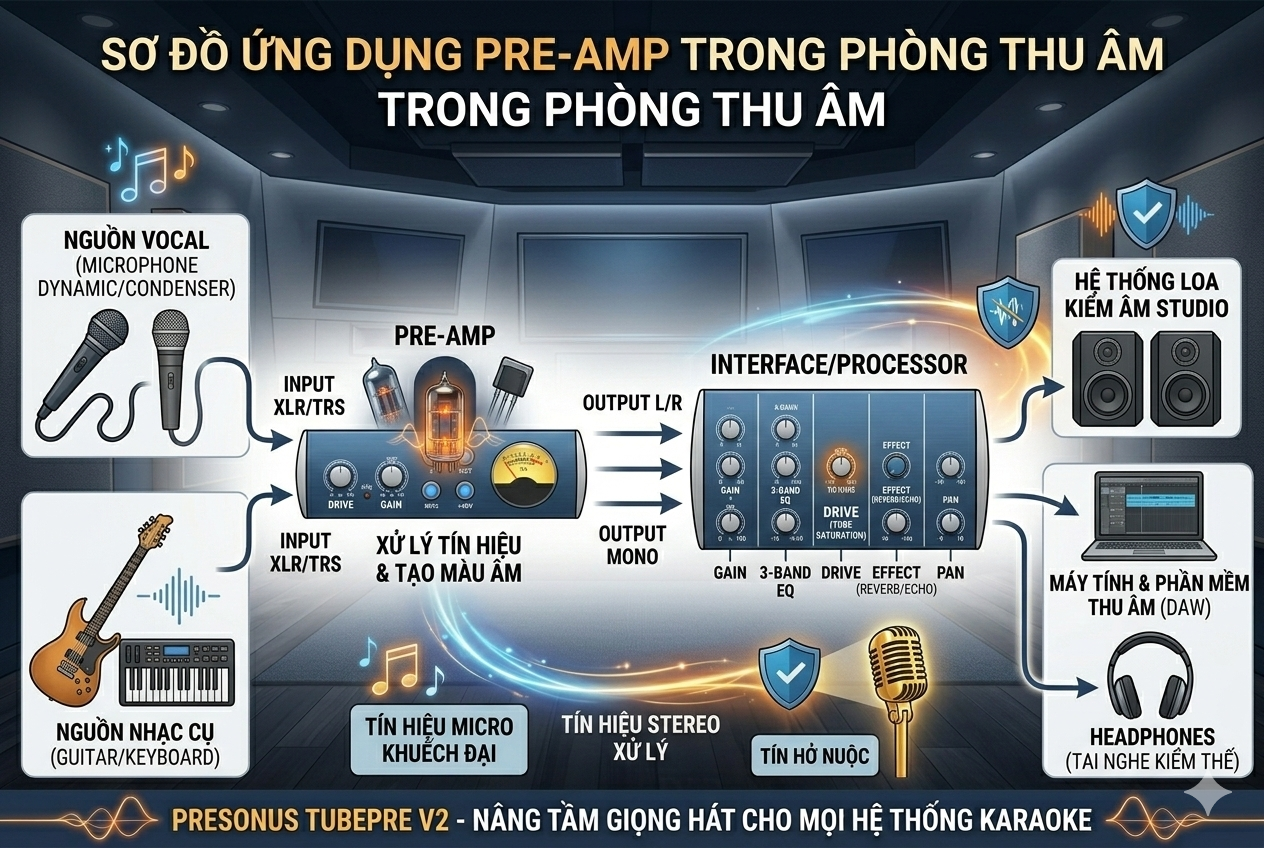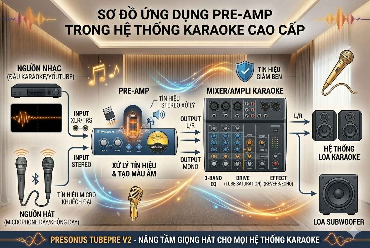 Tìm hiểu Pre-Amp là gì, vai trò của Pre-Amp đèn cho micro trong hệ thống karaoke và âm thanh biểu diễn. Khám phá cách PreSonus TubePre V2 giúp giọng hát dày, ấm và chuyên nghiệp hơn.