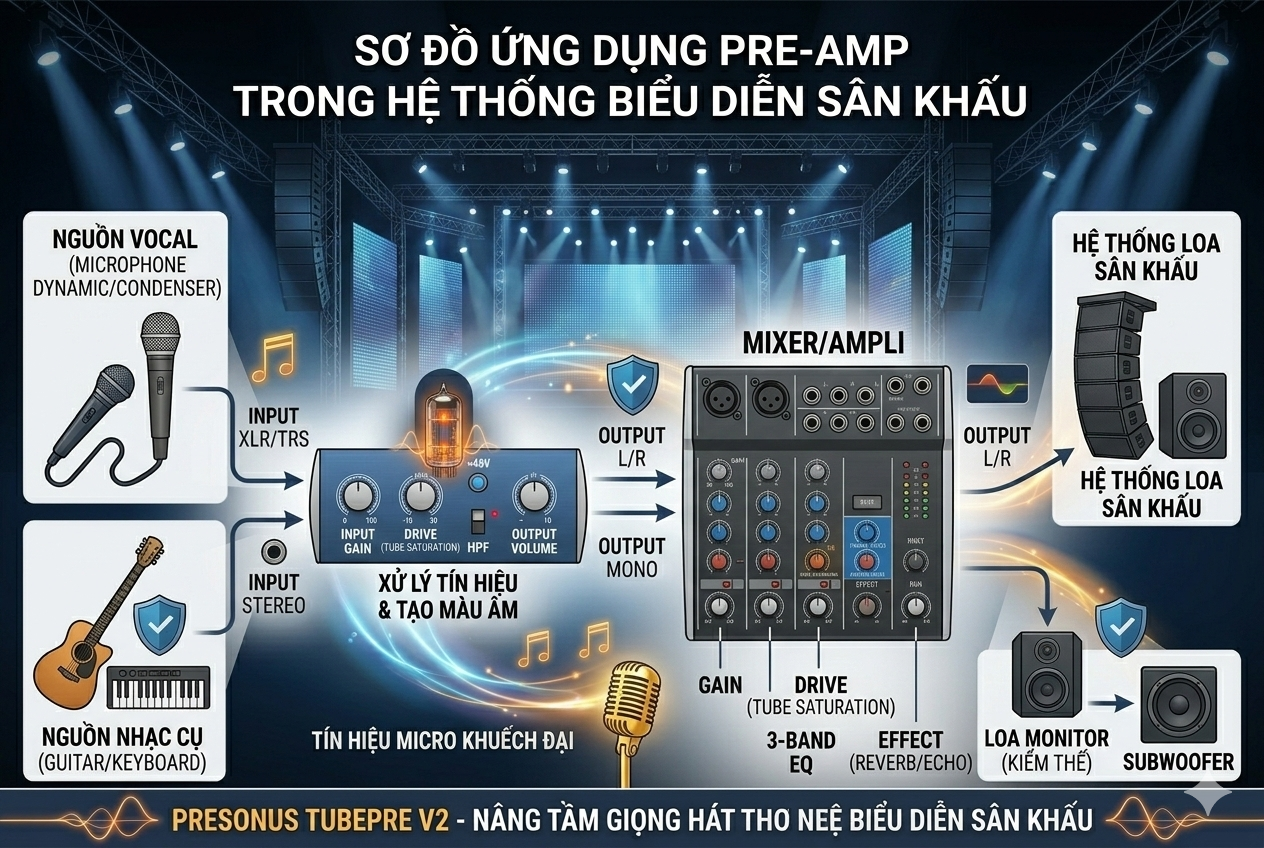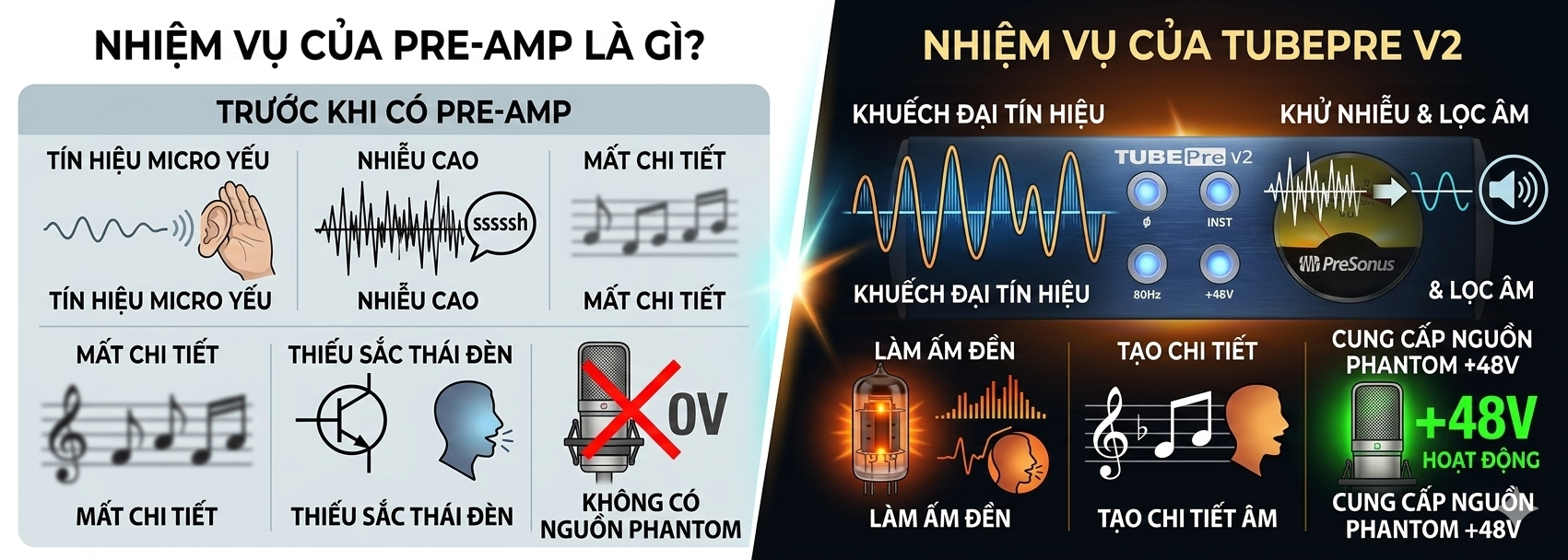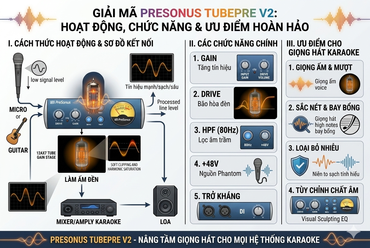 Tìm hiểu Pre-Amp là gì, vai trò của Pre-Amp đèn cho micro trong hệ thống karaoke và âm thanh biểu diễn. Khám phá cách PreSonus TubePre V2 giúp giọng hát dày, ấm và chuyên nghiệp hơn.