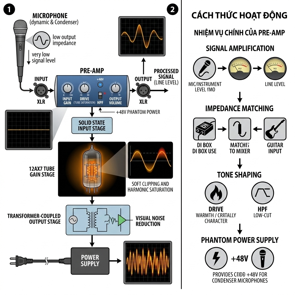 Để hiểu rõ hơn giá trị của Pre-Amp đèn, chúng ta cần hiểu cách nó xử lý tín hiệu.