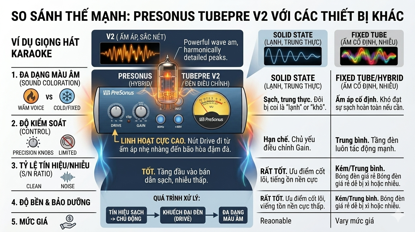 Đối với những người yêu ca hát hoặc muốn nâng cấp hệ thống âm thanh của mình, việc bổ sung một Pre-Amp đèn như PreSonus TubePre V2 có thể mang lại sự thay đổi rất đáng kể.