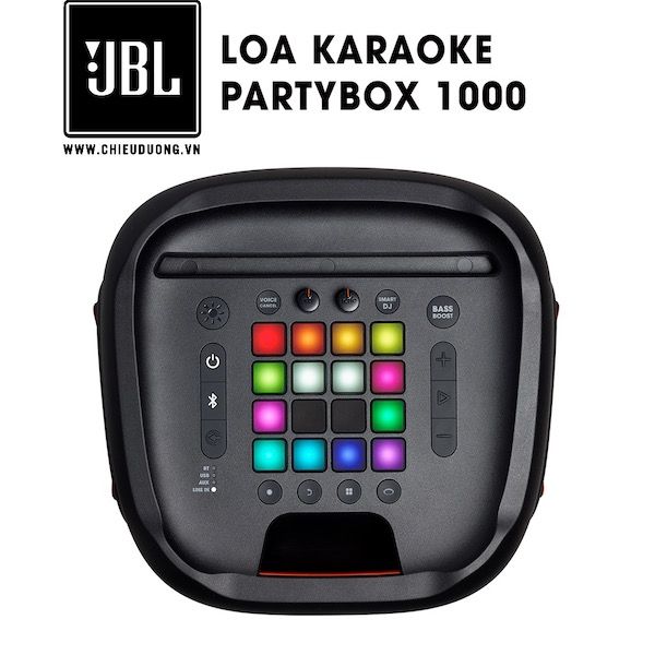 Còn ở trên đỉnh loa thì Partybox 1000 có cả một bộ nút điều chỉnh để khách hàng thỏa sức chơi DJ, với bộ DJ Launch-Pad 4×4. Điều đặc biệt mà hãng JBL đem đến lần này cho Partybox 1000 là dây đeo cổ tay Air Gesture cho phép kiểm soát ánh sáng bằng cử chỉ tay. Loa Partybox 1000 sở hữu âm thanh 3 chiều siêu trầm, trang bị củ loa downfiring subwoofer 12 inch, nôm na là củ loa hướng âm thanh xuống sàn nhà.